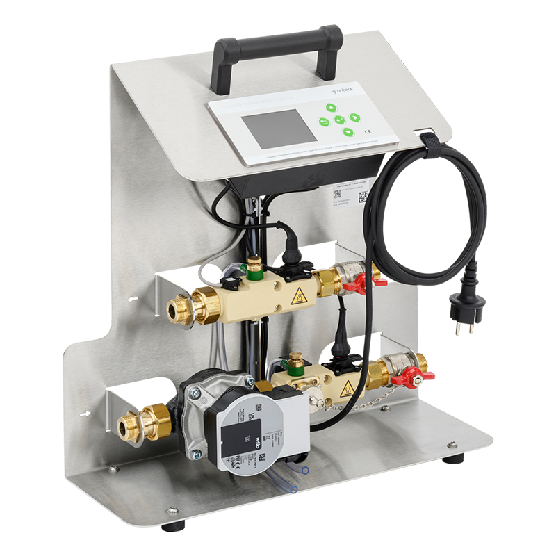 L'ergonomica maniglia di trasporto e il ridotto peso totale di meno di 10 kg consentono di trasportare comodamente il modulo di controllo in linea desaliQ nel luogo di installazione. Nonostante il peso minimo, Grünbeck offre massime prestazioni: con il modulo di controllo in linea desaliQ è possibile trattare impianti con temperatura dell'acqua fino a 80 °C durante l'esercizio. L'elevata capacità di ricircolo permette, inoltre, di ridurre al minimo il tempo di trattamento.